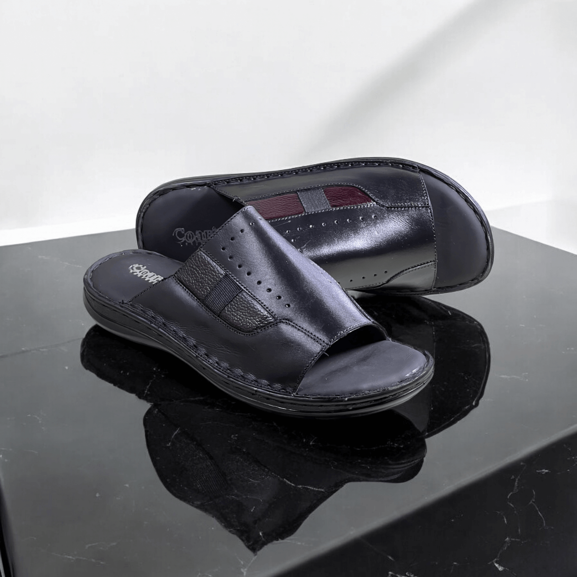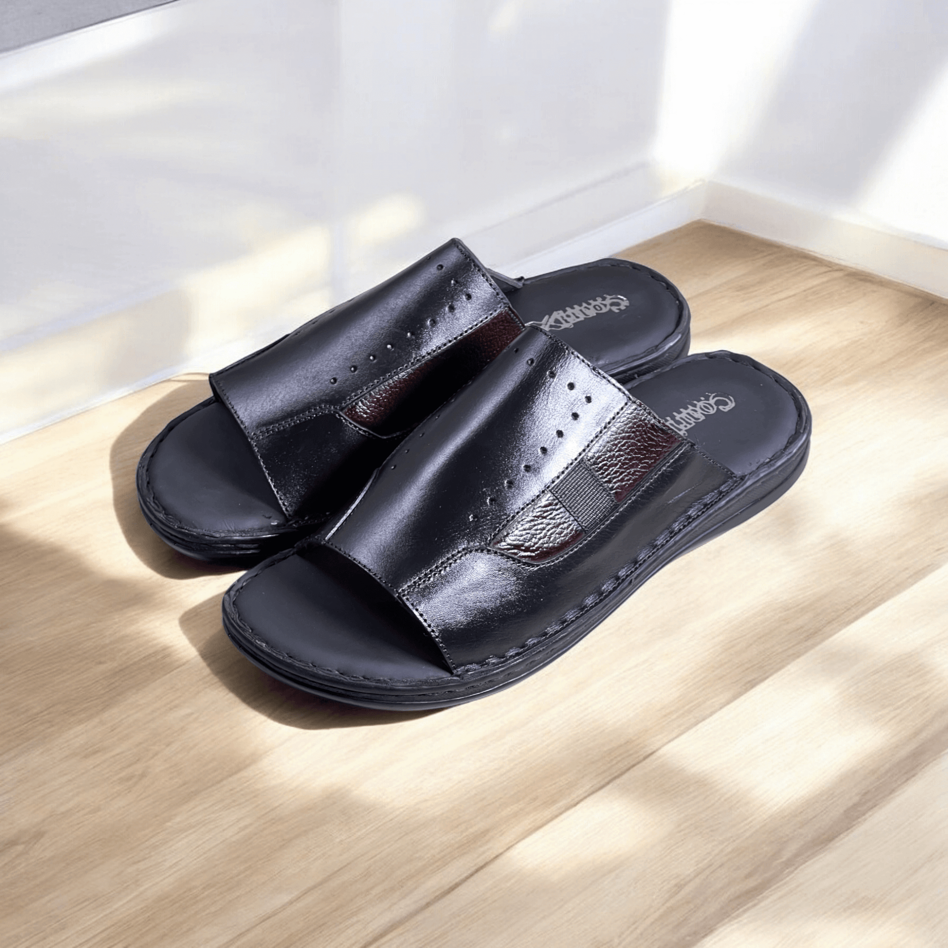 Crafted with the finest materials, our Black-3012 handmade premium leather slippers offer superior comfort and durability. Made by expert craftsmen, these slippers are perfect for both indoor and outdoor wear. Indulge in luxury and style with our Black-3012 slippers.