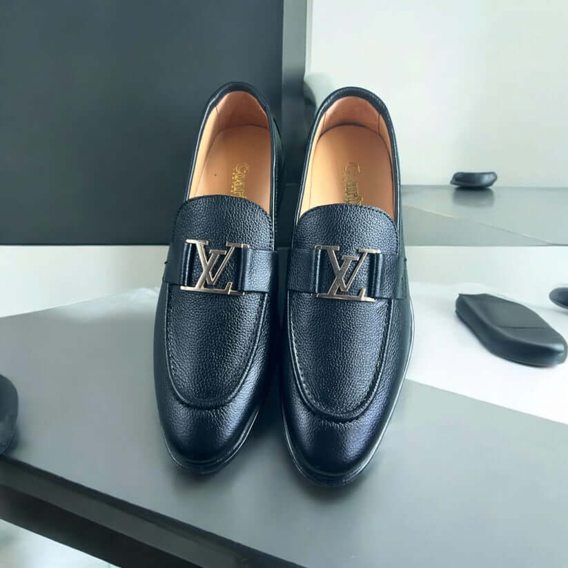 LV Buckle Soft Leather-2015 features comfortable and classy grain leather with a moccasin-style design on a durable rubber sole. The high-quality materials not only provide a luxurious feel but also ensure long-term comfort and style. Perfect for any occasion, this shoe combines fashion and functionality seamlessly.